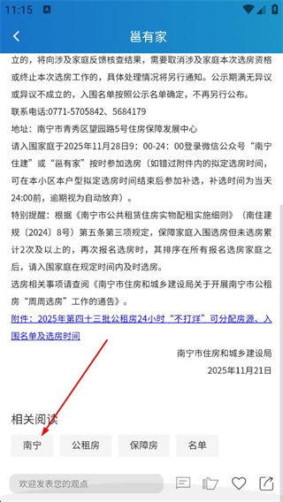 3、進入文章詳情頁,閱讀公租房分配房源等信息,查看聯系電話和地址,了解選房相關規則,獲取房產政策的詳細說明。