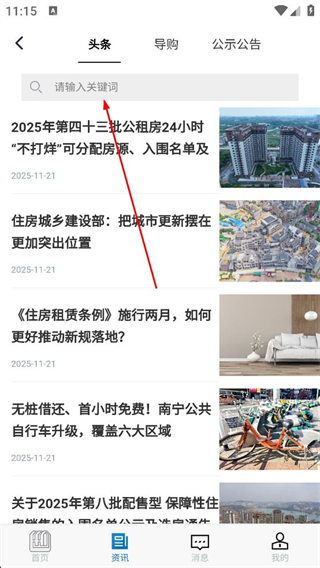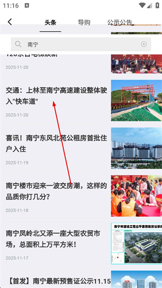 4、在搜索框輸入南寧等關鍵詞,瀏覽交通公租房交房等相關資訊,點擊對應文章查看內容,了解本地房產及城市建設動態。