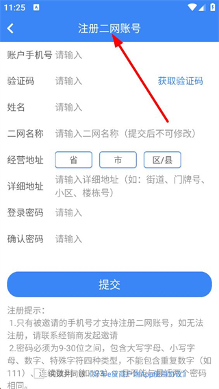 4、點擊注冊二網賬號進入對應頁面,填寫手機號驗證碼姓名等信息,設置密碼后點擊提交,即可完成該賬號的注冊流程。