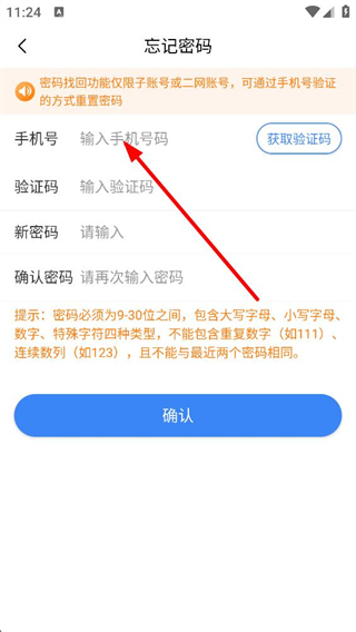 2、點擊忘記密碼進入對應頁面,輸入手機號獲取驗證碼,設置符合規則的新密碼并確認,操作完成后點擊確認按鈕重置密碼。