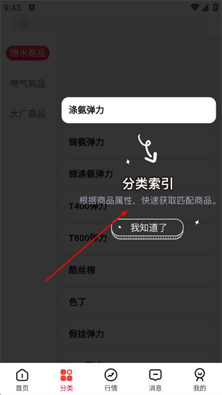 2、進入分類頁面點擊分類索引提示的我知道了,可根據商品屬性如滌氨彈力等快速獲取匹配商品。