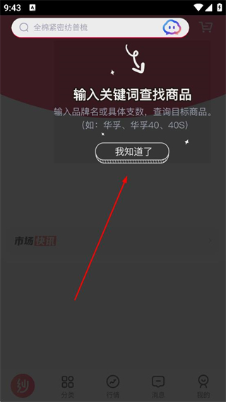 1、打開有紗紡織app首頁,點擊搜索框提示的我知道了,可輸入關鍵詞查找商品,如品牌名或具體支數來查詢目標商品。