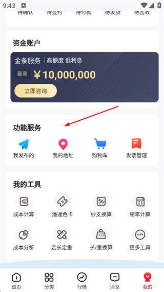 4、進入我的頁面可查看資金賬戶、功能服務如我的地址購物車等,還有成本計算等工具,滿足多種操作需求。
