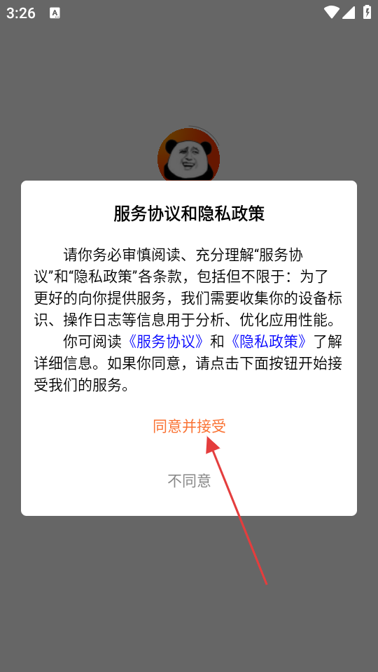 1、進入應用,點擊同意并接受按鈕,接受服務協議和隱私政策,進入應用主界面。