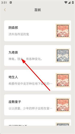 3、進入百妖頁面,可看到陰森邪九絕獸等地妖怪條目,每個條目配有簡介,選擇對應的條目,即可查看其詳細信息。