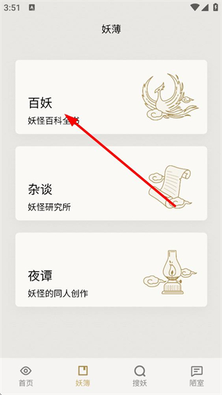 2、進入妖簿界面,能看到百妖雜談夜譚三個分類,其中百妖是妖怪百科全書,選擇對應分類,即可進入相關內容頁面。