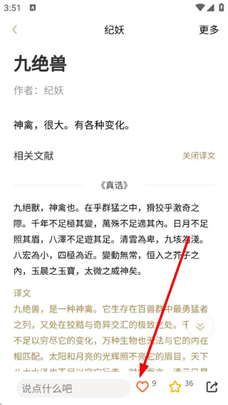 4、進入具體妖怪的詳情頁,能查看該妖怪的簡介、相關文獻及譯文,還可通過點贊收藏按鈕,進行互動操作。