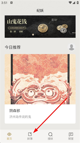 1、進入紀妖首頁,可看到今日推薦的妖怪內容,底部設有妖簿選項,點擊該選項,即可進入妖簿對應的分類選擇界面。