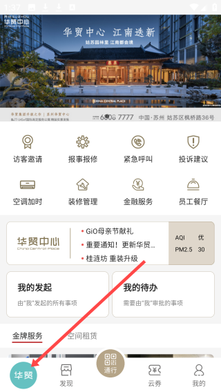 1、展示華貿中心相關應用的華貿頁面,有訪客邀請等多項服務功能,還顯示重要通知,下方分我的發起和我的待辦。