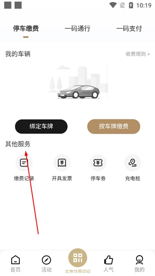 2、在停車繳費頁面查看其他服務選項,可使用繳費記錄功能查詢歷史賬單,也能開具發票、使用停車券,還可找到充電樁相關服務入口。