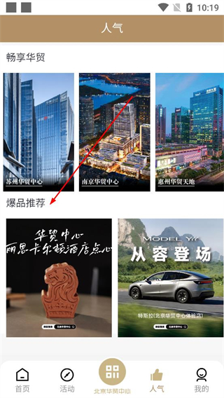 3、切換至人氣板塊瀏覽華貿相關建筑展示,查看爆品推薦內容,選擇感興趣的推薦條目,點擊進入詳情頁。