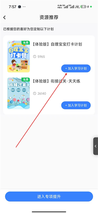 2、偏好設置后進入資源推薦頁面,查看根據偏好定制的計劃,選擇目標計劃如自理寶寶打卡計劃,點擊加入學習計劃按鈕。