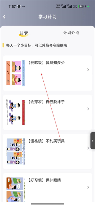 4、在計劃目錄頁面選擇具體學習內容如餐具知多少,點擊進入對應內容的學習界面,開始按計劃進行學習。