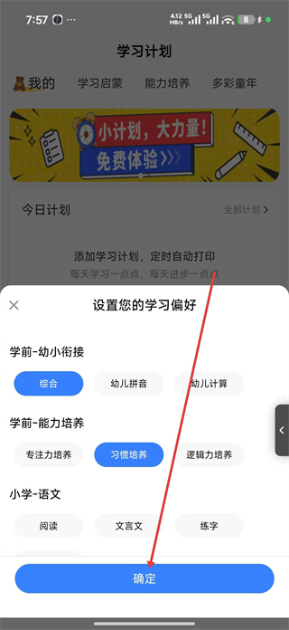 1、進入學習計劃頁面,打開設置您的學習偏好彈窗,選擇學前綜合、習慣培養等偏好選項,點擊確定按鈕,完成學習偏好設置。