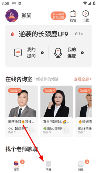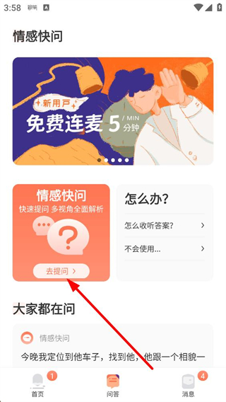 2、問答頁面可進入情感快問板塊,新用戶能享受免費連麥福利,點擊去提問按鈕即可進入提問界面,快速發起情感相關的咨詢請求。
