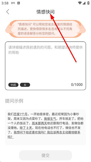 3、情感快問頁面支持詳細描述遇到的情感問題,可標注自身信息,參考提問示例完善內容后提交,就能獲得多名咨詢師的語音解答分析。