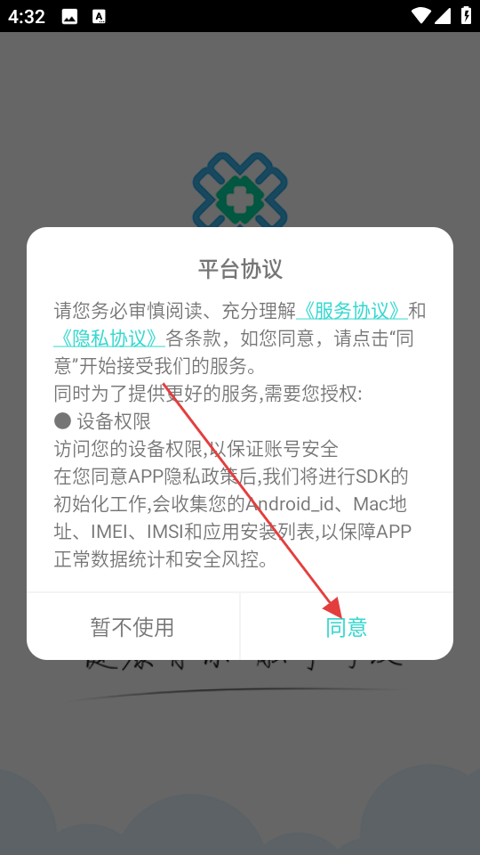 1、打開江蘇互聯網醫院醫生版,首先彈出平臺協議提示框,這里詳細說明了服務協議和隱私協議的相關內容,點擊同意按鈕進入登錄界面。