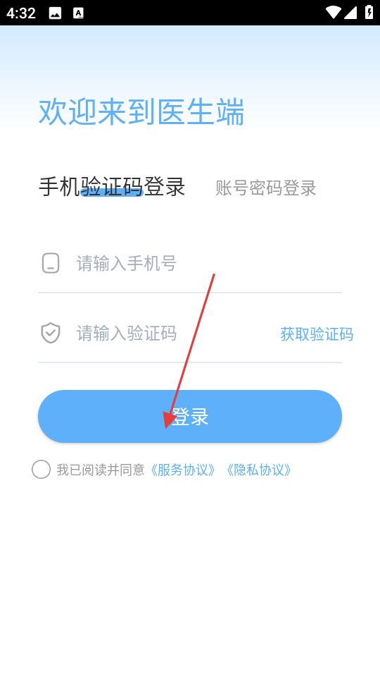 2、同意協議后進入當然頁面,選擇手機驗證碼登錄方式,在請輸入框中填入注冊手機號和驗證碼,點擊登錄按鈕即可完成手機驗證碼登錄操作。