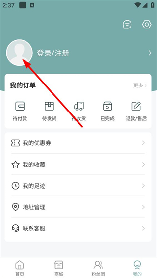 2、我的頁面能看到我的訂單我的優惠券等功能選項,點擊登錄、注冊區域,進入賬號登錄與注冊的選擇界面。