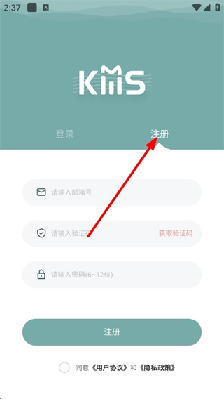 4、切換到注冊頁面,填寫郵箱號獲取并輸入驗證碼,設置密碼后勾選協議,點擊注冊按鈕,完成賬號的注冊流程。
