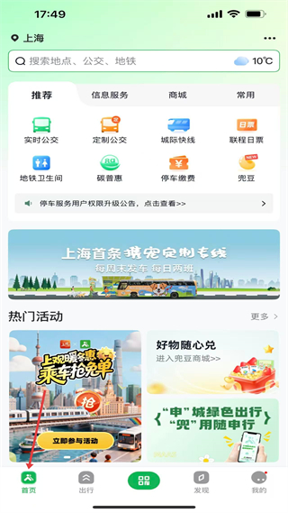 1、首頁,定位上海,有搜索欄,設多服務板塊,提供實時公交等功能,展示熱門活動,是綜合服務入口。