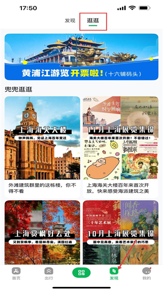 3、隨申辦發現逛逛界面,展示上海本地游覽信息,如黃浦江游覽、上海海關大樓、展覽集錦、賞楓好去處等。