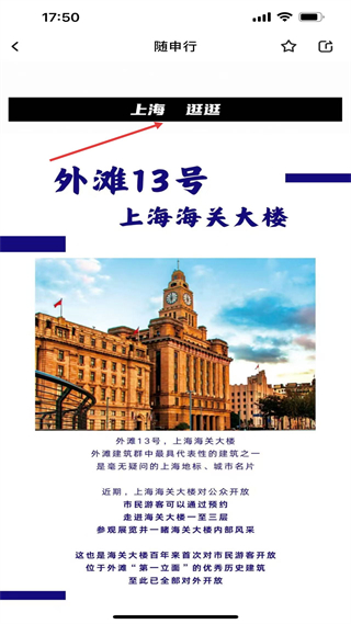 4、上海海關大樓詳情頁,介紹其為上海地標,近期首次對公眾開放,市民游客可預約參觀一至三層,感受海派建筑之美。
