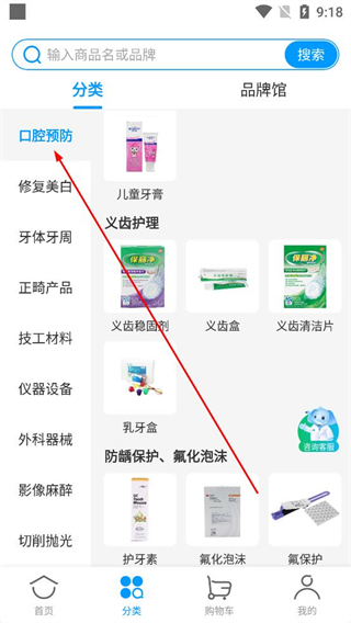 3、登錄后進入分類頁面查看口腔預防修復美白等分類,選擇目標分類如義齒護理,瀏覽相關商品。