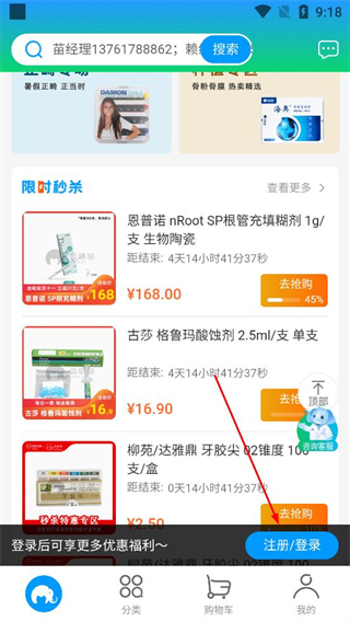 1、打開軟件進入首頁,瀏覽限時秒殺板塊的口腔用品,點擊注冊登錄按鈕,進入齒噠噠的登錄界面。