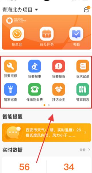 1、APP界面有報修報事等功能模塊,點擊拜訪業主可查看拜訪數據,包括已拜訪和未拜訪戶數及各小區房號信息。
