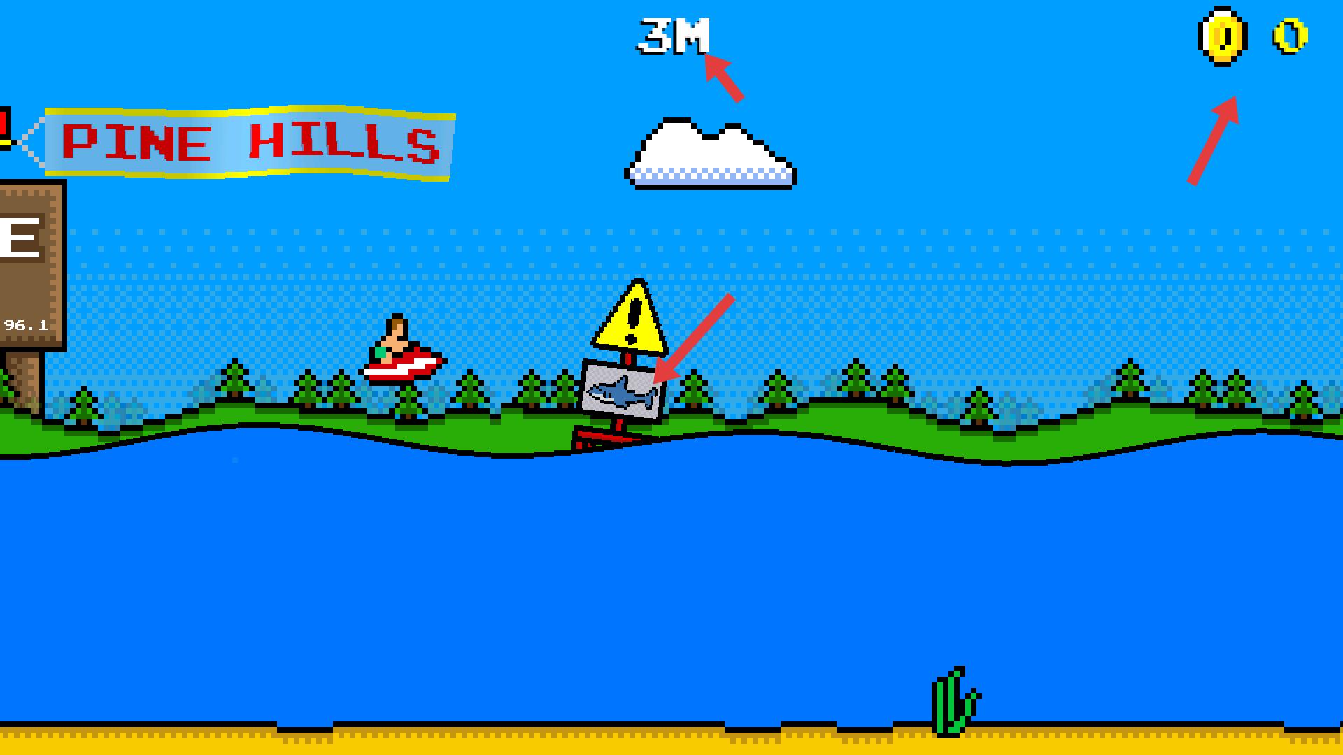 2、進入游戲后,留意場景中的鯊魚警示標志,上方有距離和金幣顯示,操控水上摩托時,注意躲避鯊魚,同時盡量收集金幣,提升游戲收益。