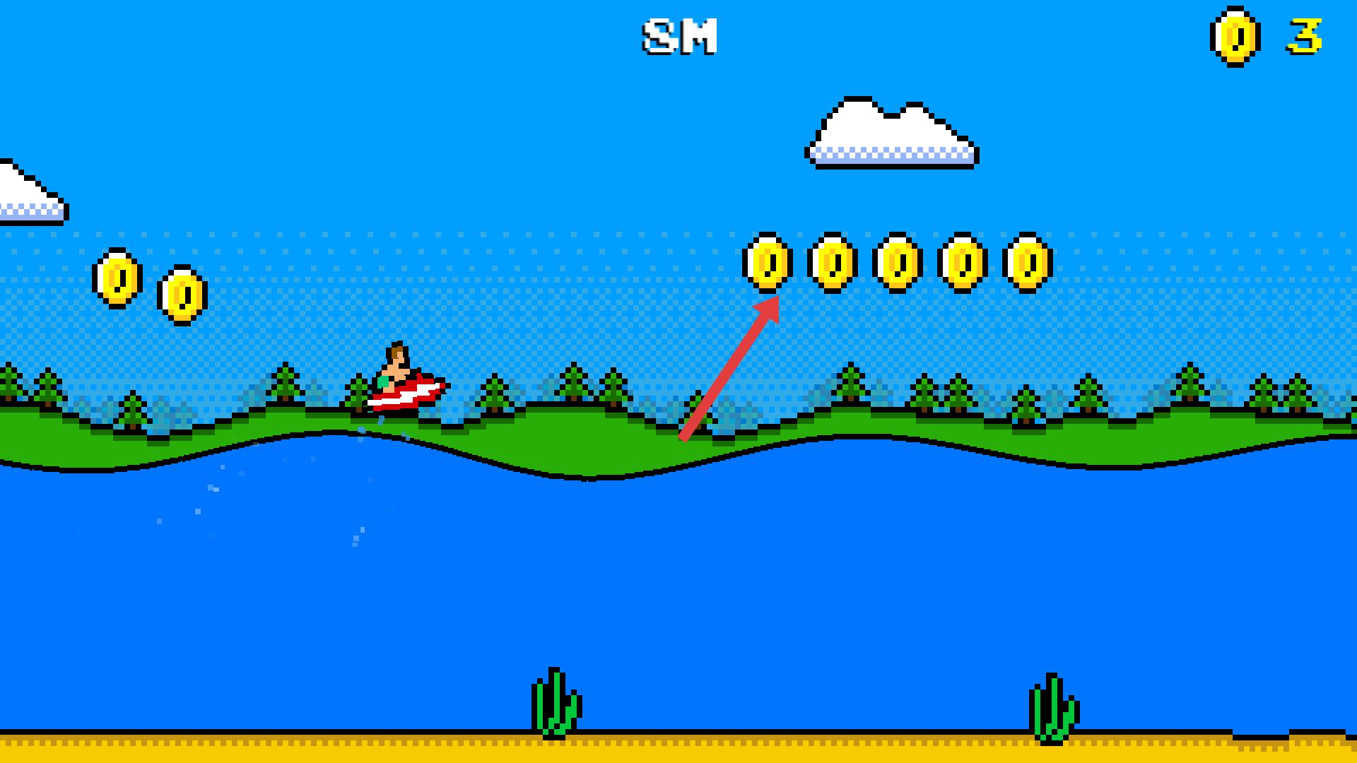 3、游戲過程中,會遇到多排金幣,操控水上摩托調整方向,通過點擊和釋放屏幕,讓摩托跳躍或下潛,精準收集這些金幣,增加金幣數量。