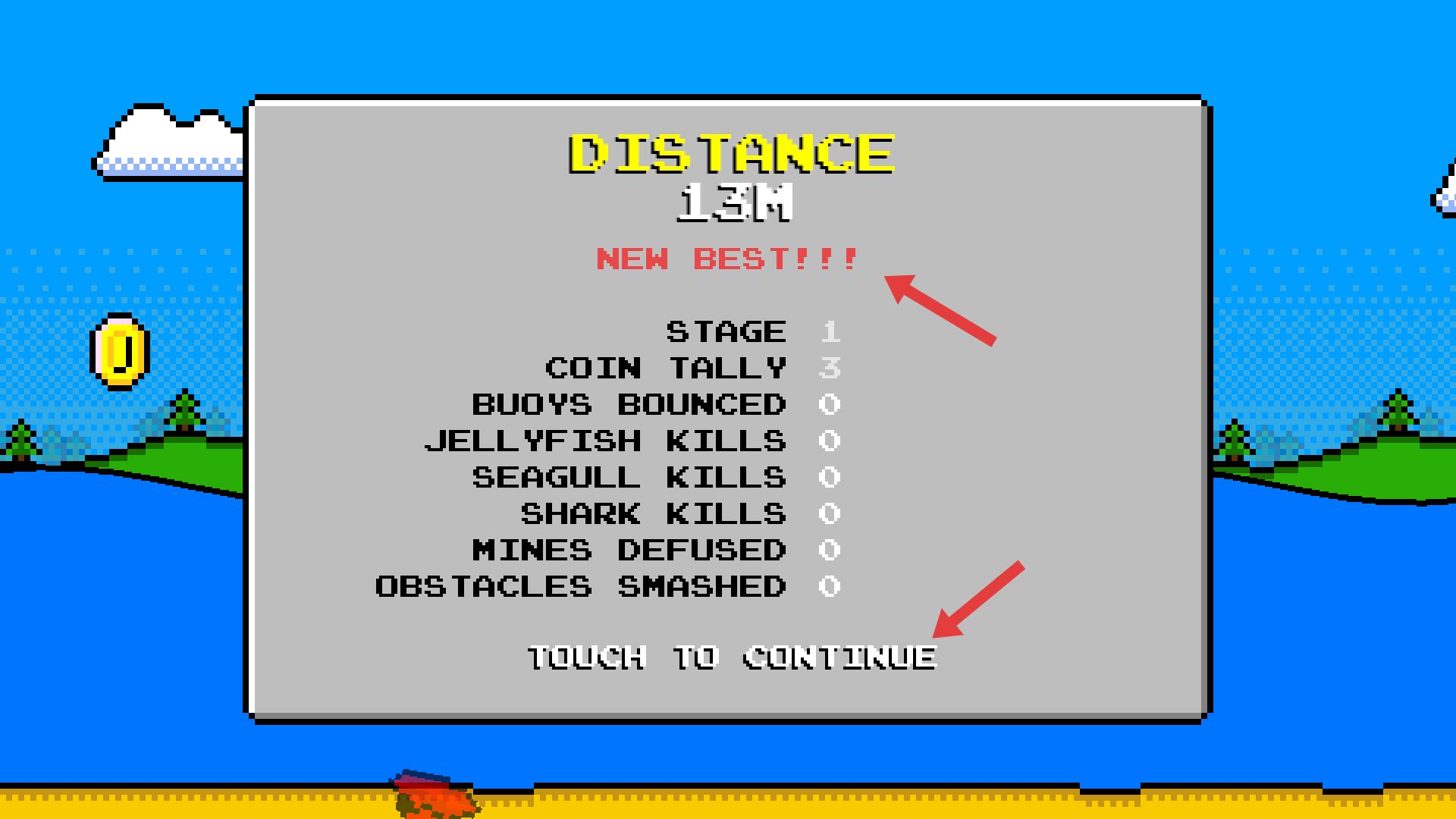 4、游戲結束后,界面顯示行駛距離、金幣數量等數據,若創造新紀錄會有歷史最好提示,點擊箭頭提示位置,可繼續游戲或查看其他內容。