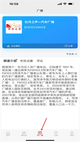 3、聽廣播板塊,有牡丹之聲汽車廣播,頻率FM103.5MHz,可點擊播放收聽,還有頻道介紹和節目單,用戶可收聽本地廣播內容。