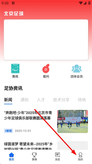 1、進入首頁可查看足協資訊,包含新聞通知人才等板塊,還能通過底部導航切換至賽事消息我的等功能區,同時支持教練裁判團體會員等身份相關操作。