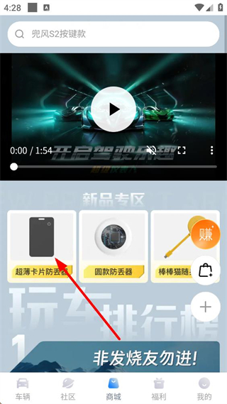 2、進入商城頁面,頂部設有搜索框,頁面含宣傳視頻板塊,新品專區陳列超薄卡片防丟器圓款防丟器等商品,點擊超薄卡片防丟器,進入對應的商品詳情頁面。