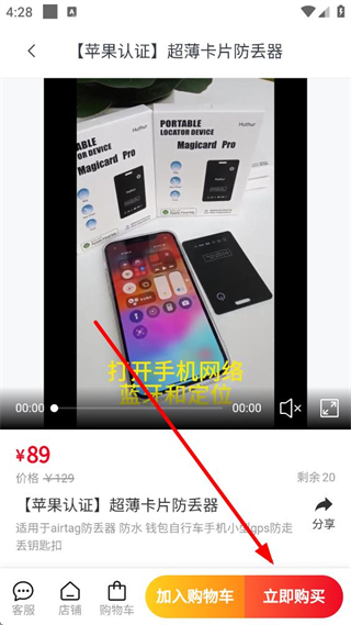 3、進入超薄卡片防丟器的詳情頁面,可見商品展示圖、價格及適用范圍等信息,底部設加入購物車和立即購買按鈕,點擊立即購買進入商品下單頁面。