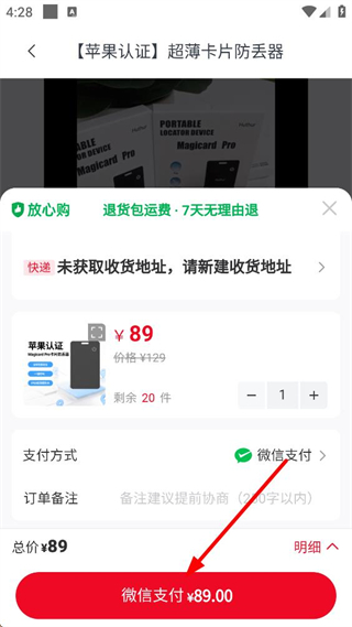 4、進入超薄卡片防丟器的下單頁面,需先新增收貨地址,確認商品數量與微信支付方式后,點擊微信支付按鈕,即可完成該商品的購買支付操作。