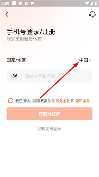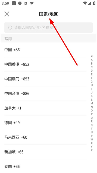 2、進入手機號登錄、注冊頁面,找到國家、地區選項,點擊該選項,即可進入對應的區域選擇界面。
