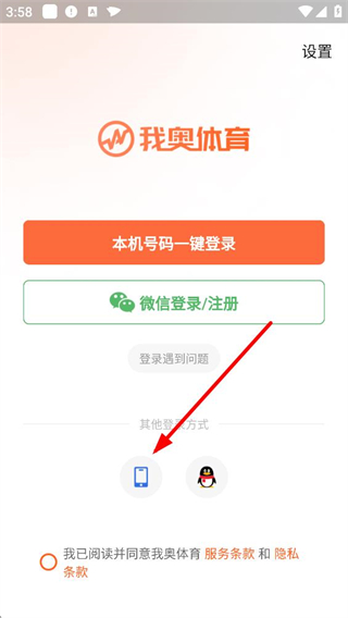 1、進入我奧體育的登錄界面,能看到本機號碼一鍵登錄、微信登錄等選項,點擊其他登錄方式里的手機圖標,進入手機號登錄、注冊頁面。