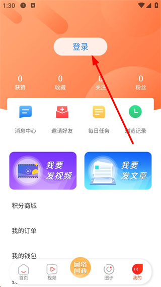 2、我的頁面,可查看獲贊、收藏等數據,使用消息中心、邀請好友等功能,還能進行發視頻、發文章操作,點擊登錄按鈕進入登錄界面。