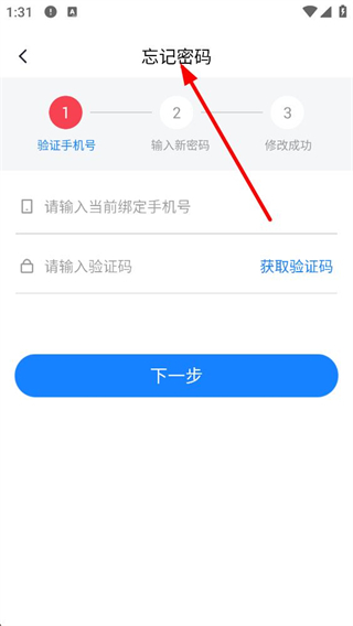 4、若忘記密碼,進入忘記密碼頁面,先驗證綁定手機號,輸入驗證碼后點擊下一步,后續可完成新密碼設置,最終實現密碼修改。