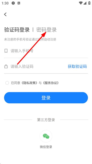 3、登錄界面支持驗證碼登錄和密碼登錄,未注冊手機號驗證通過后會自動注冊,也可勾選協議后用微信等第三方方式完成登錄。