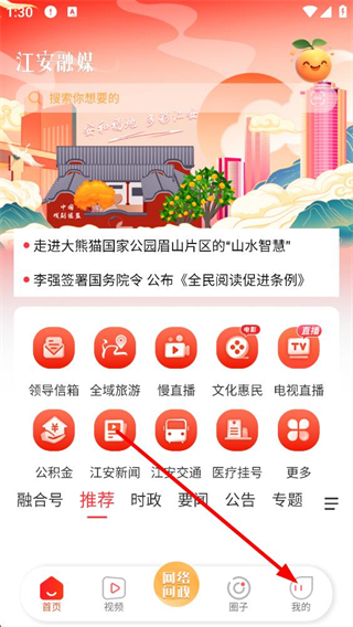 1、進入江安融媒首頁,可瀏覽新聞資訊,使用領導信箱、全域旅游等功能,也能通過底部導航欄切換至視頻、網絡問政等板塊,點擊我的進入個人頁面。