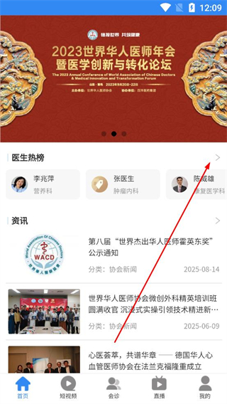 2、登錄后進入首頁可查看相關會議信息,瀏覽醫生熱榜和資訊板塊,選擇醫生熱榜選項,進入對應頁面查看不同地區不同科室的醫生列表。