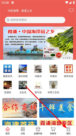 1、進入霞浦特產網首頁,可見搜索欄、霞浦海帶苗等特產介紹,還有各類資訊與商城入口,點擊底部我的按鈕,進入個人中心界面。