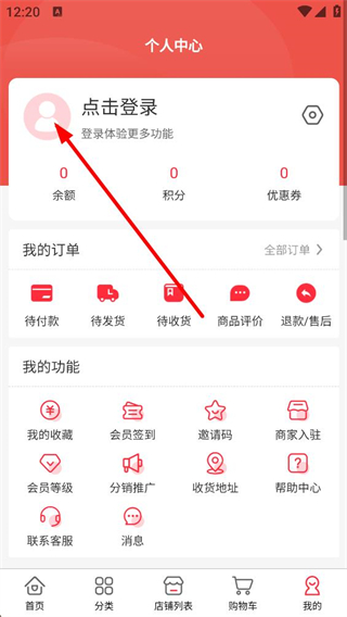 2、進入個人中心界面,顯示點擊登錄提示,還有我的訂單、我的功能等板塊,點擊點擊登錄區域,進入登錄操作界面。