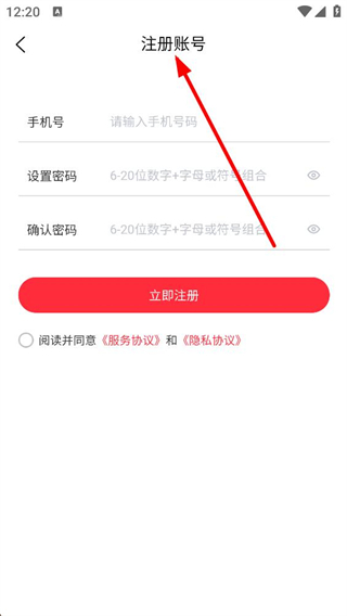 4、進入注冊賬號界面,需填寫手機號、設置符合要求的密碼并確認,勾選相關協議后,可點擊立即注冊按鈕完成賬號注冊。