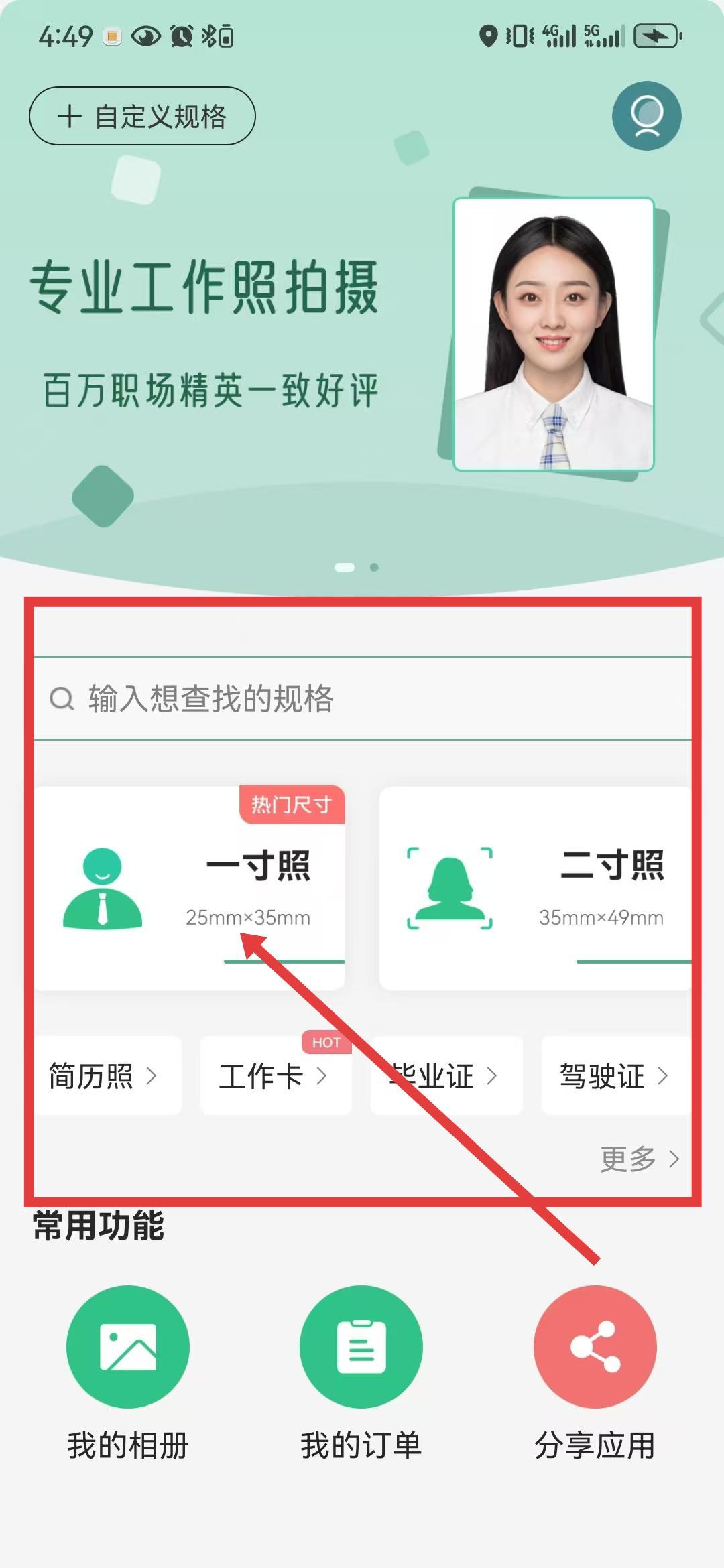 1、主界面這里有多種照片規格可供選擇,如一寸照、二寸照等,還有簡歷照、工作卡、畢業證、駕駛證等不同類型的照片選項,如點擊一寸照進入照片規格設置頁面。
