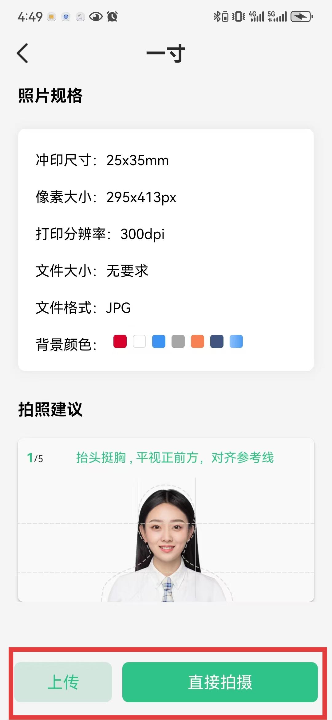 2、進入照片規格設置頁面后,可看到該規格的沖印尺寸等詳細信息,根據自身需求可選擇上傳按鈕,也可點擊直接拍攝按鈕,現場拍攝一張符合規格的照片。